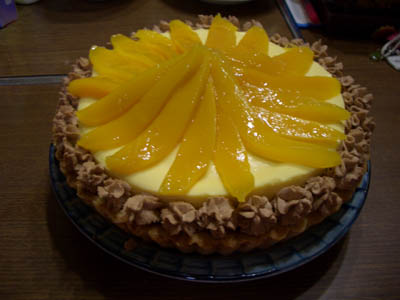 その上にマンゴー(缶詰)を乗せて淵にはチョコ生クリームを飾りました。